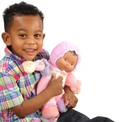 Cuddly and soft, these baby safe 12″ soft body dolls help develop motor skills and eye-hand coordination. Each doll has an animal shaped rattle in one hand and a crackle sound in the other to stimulate the senses of sight, hearing and touch. Color and fabric may vary. Includes dolls with different skin tones. Young children will enjoy pretend play with these dolls. Surface washable.