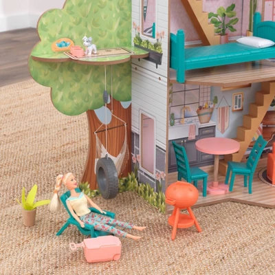 Outdoor entertaining at home is elevated with the KidKraft Backyard Cookout Dollhouse. When your backyard has a tree fort and tire swing, the fun is always “on”. Take the BBQ grill to the yard for a relaxing cookout or serve up dinner with a view on the rooftop patio. An Adirondack chair and pull-along cooler is ready to go wherever you are. Dolls up to 12” will enjoy the sleek furnishings, including a sofa with storage under the cushions. Welcome visitors with the extended entryway and door mat. Everything needed to make this a cozy home is included—even an adorable pup. Explore all three levels of this bright and cheerful Backyard Cookout Dollhouse from KidKraft.