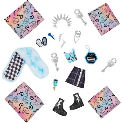 - Frankie Stein doll and their fashion surprises shine with gore-geously glam, pearly details in this Fearidescent edition of Skulltimate Secrets! Open their locker for voltageous finds.