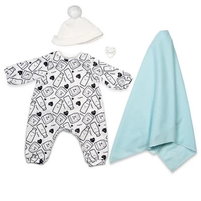 Comes with a long-sleeved jumpsuit, knit cap with a large pompom, swaddling blanket, and a magnetic pacifier.